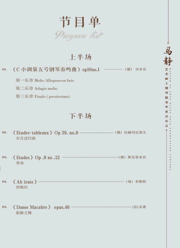 黑色和白色是最朴素的颜色,但却是万千世界绚丽的起点,我们用黑白相间的眼睛,欣赏世界每一个色彩斑斓的角落;我们在黑白交错的24小时里,感受春夏秋冬的唯美浪漫;我们更可以用黑白交错的琴键,弹奏出跌宕起伏、百转千回的乐章。马静艺术硕士毕业独奏音乐会,用钢琴传递情感,带你走进西方音乐艺术长河。