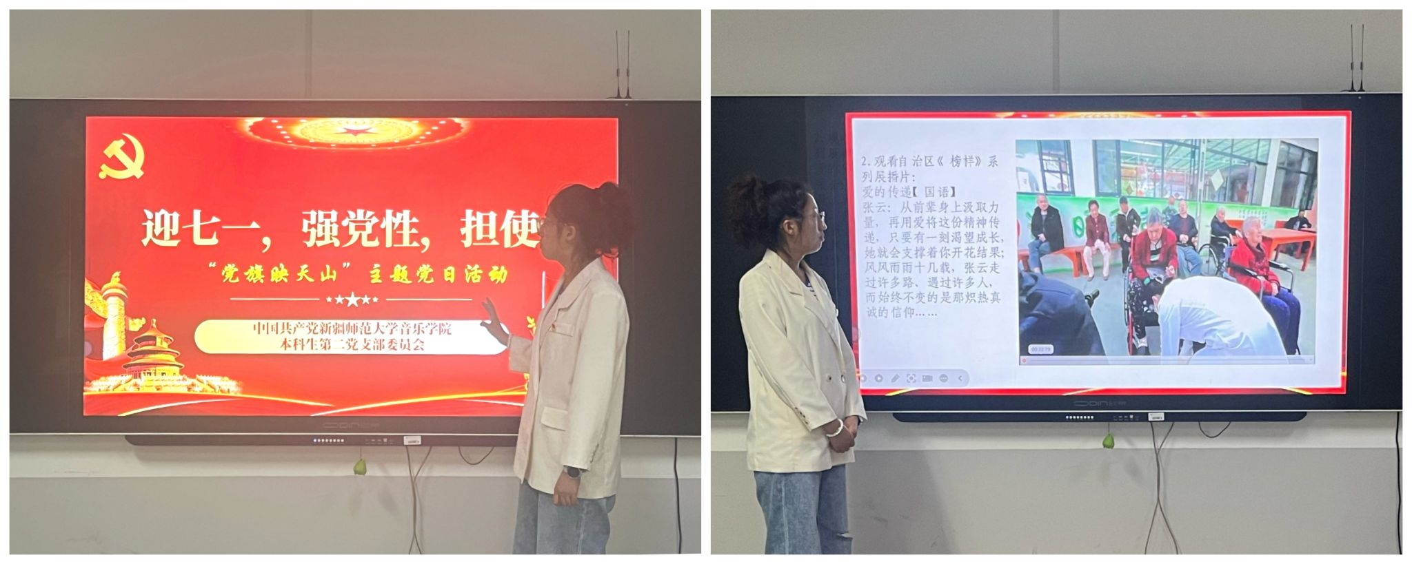 活动最后,陈怡、郭铭渲、古丽扎尔三位老师的琴声伴奏,党员教师们齐声高唱《没有共产党就没有新中国》《我和我的祖国》《送我一支玫瑰花》等经典曲目,以歌舞形式抒发爱党爱国情怀,将活动氛围推向高潮。