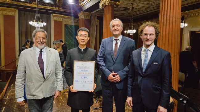 邓文欢老师参加2024勃拉姆斯国际乐团指挥比赛荣获金奖,与米尔茨市市长及部分评委合影